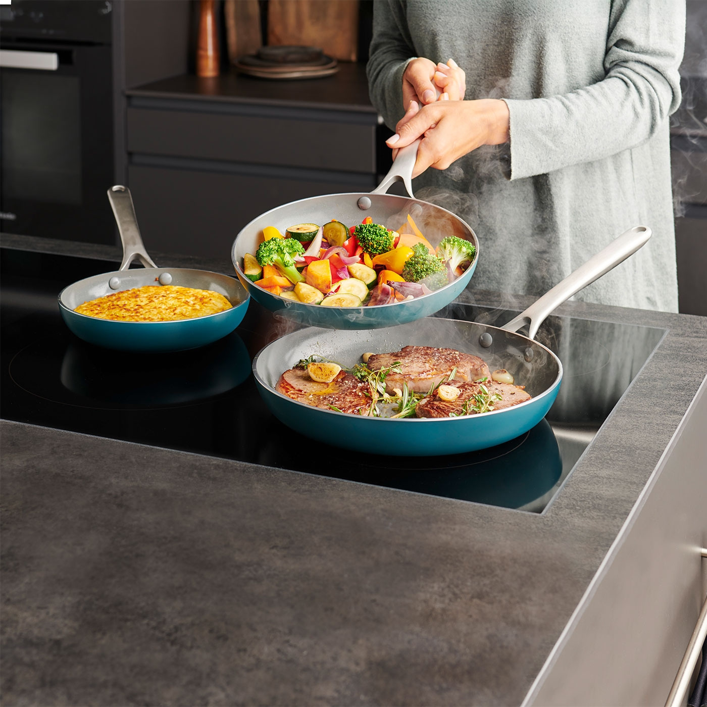 Die Pfanne ist nicht nur ein optischer Hingucker in frischem Grün, sondern kommt auch komplett ohne PFAS aus. Mit wenigen Handgriffen ist sie nach dem Einsatz wieder blitzblank. Ein praktischer und lösungsorientierter Helfer, der dir im Alltag wertvolle Zeit spart und Freude in deine Küche bringt.