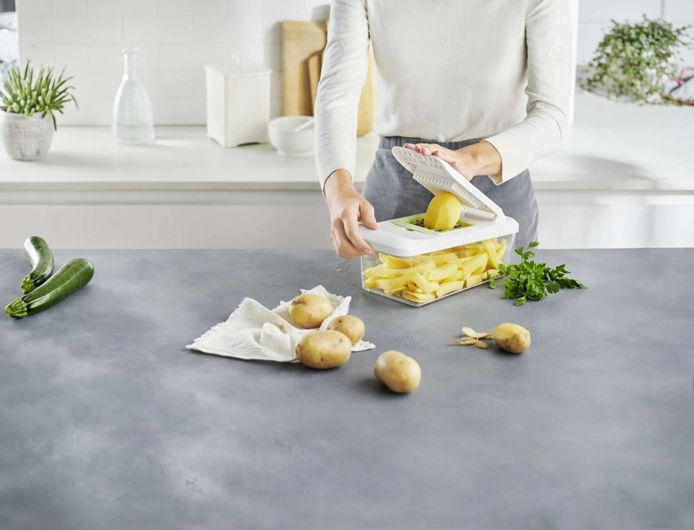 Schneller, sicherer und sauberer hast du Gemüse und Obst noch nie geschnitten! Ob für Salate oder Beilagen, mit dem Gemüseschneider kannst du mühelos wunderbare Gerichte zubereiten. Gemüse und Obst lassen sich mit dem Gemüseschneider im Eilzugstempo manuell und ohne grossen Kraftaufwand exakt in diverse Stäbchen- und Würfelvariationen schneiden.