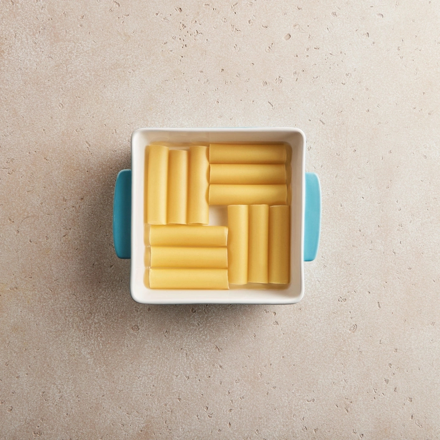 Die hübsche quadratische Auflaufform ist exakt auf Lasagneblätter und Fertig-Pastateig ausgerichtet. Du brauchst die getrockneten Lasagne-Blätter ab sofort nicht mehr zu brechen, um sie dann in der Form drin wieder puzzleartig anzuordnen. Das erleichtert die Zubereitung und spart Zeit. Aber das ist noch nicht alles: Auch die im Handel erhältlichen Cannelloni-Rollen lassen sich versetzt prima in diese eckige Form einfüllen, was dem Gratin erst noch eine spannende Optik verleiht.