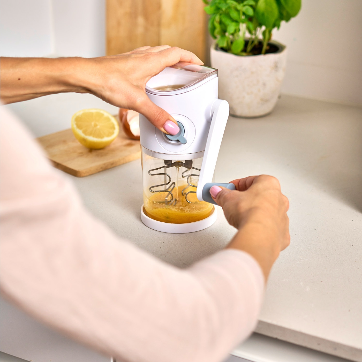 Der Saucen-Blitz überzeugt nicht nur durch seine Funktionalität, sondern auch durch sein durchdachtes Design. Der Antirutsch-Boden sorgt für sicheren Halt beim Kurbeln und dient gleichzeitig als Deckel, um die selbstgemachte Mayonnaise oder Sauce im Kühlschrank aufzubewahren. So bleibt alles frisch und du hast jederzeit die perfekte Sauce zur Hand.