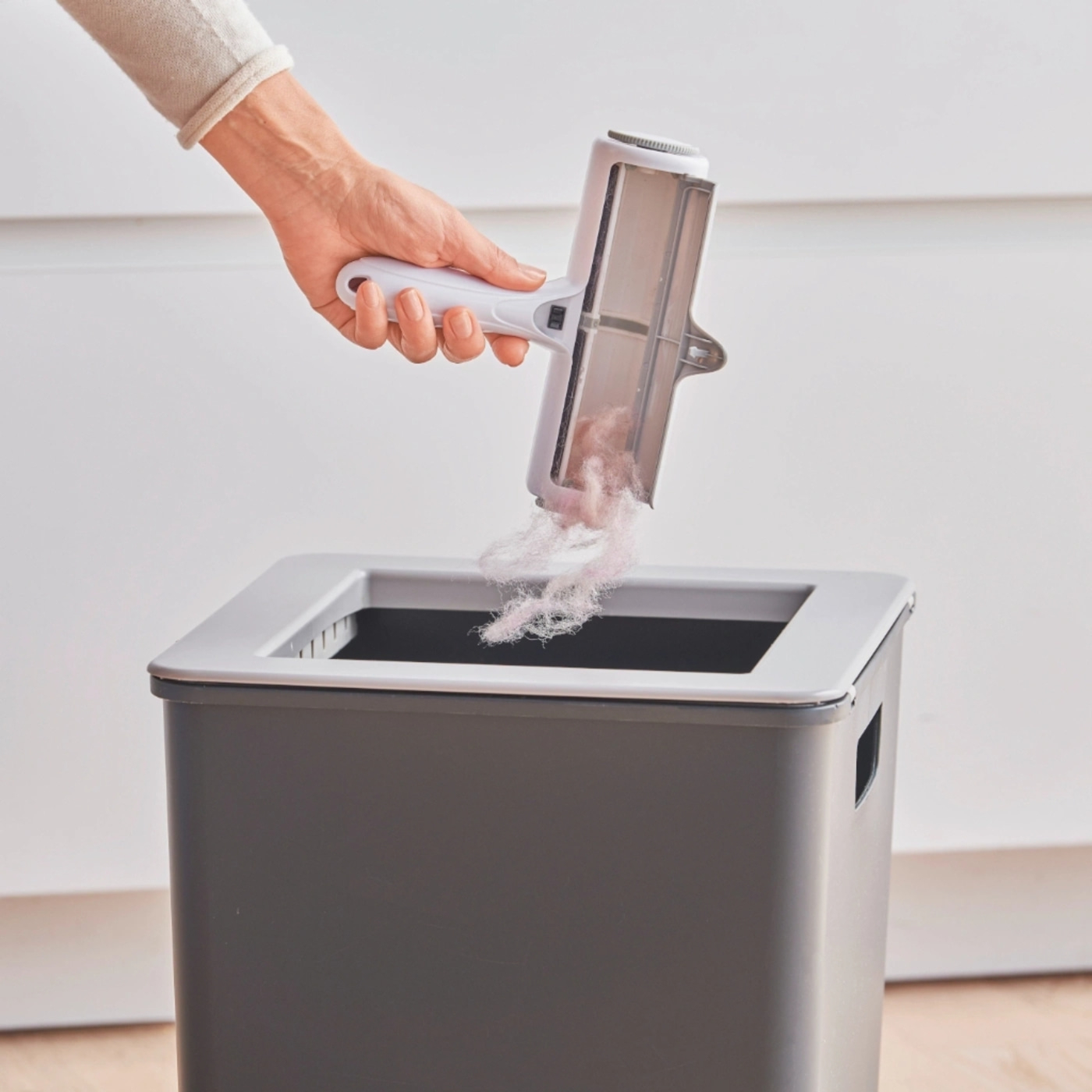 Das patentierte Bürstensystem sammelt bei einfachen Hin-und-her-Bewegungen Haare, Fusseln und feinen Staub von Textilien ein. Statt an einer klebrigen Folie bleiben die Partikel in einem integrierten Schmutzbehälter hängen. Mit einem Klick öffnest du den Behälter und entleerst ihn direkt in den Abfall – die Rolle ist sofort wieder parat, ganz ohne Nachfüllen oder Ersatzrollen.