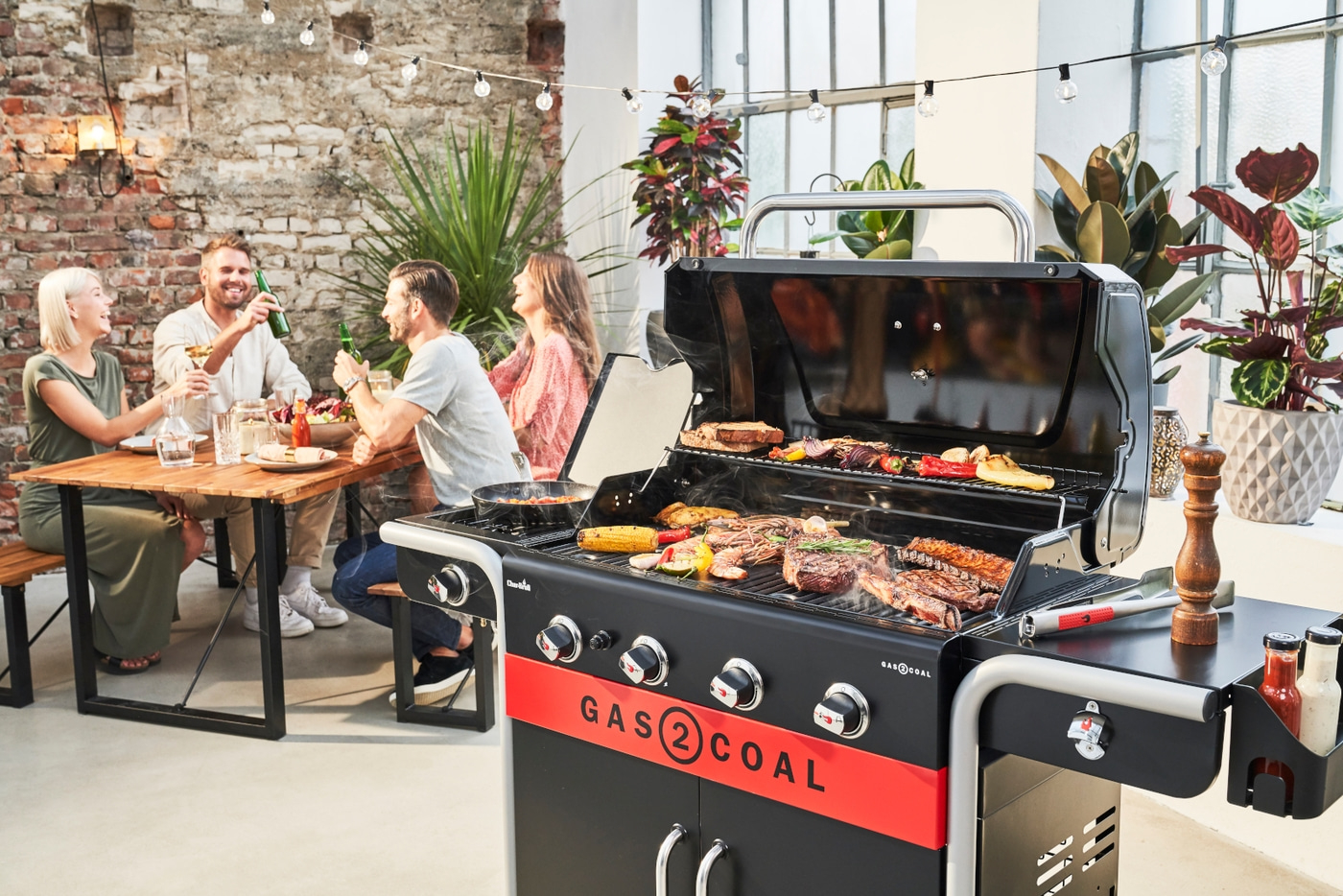 Für alle, die sich nicht zwischen der Einfachheit von Gas und dem Geschmack von Holzkohle entscheiden können: der Gas2Coal Hybridgrill. In weniger als 60 Sekunden ist er vom Gasgrill zum Holzkohlegrill umgebaut und das ohne die Hilfe eines einzigen Werkzeuges. Die Holzkohle wird einfach in unsere patentierte Holzkohleschale gefüllt und über die Gasbrenner aus Edelstahl entzündet, ganz ohne Grillanzünder. Dabei sorgt das Design der Holzkohleschale für eine gleichmäßige Hitzeverteilung. Diese und auch die gusseisernen Roste können bequem mit dem beigelegten Heber gehandhabt werden. Das Innere der Neuauflage unseres Dauerbrenners bietet Platz für eine Gasflasche, die man leicht über die Zugangsklappe an- und abschließen kann.