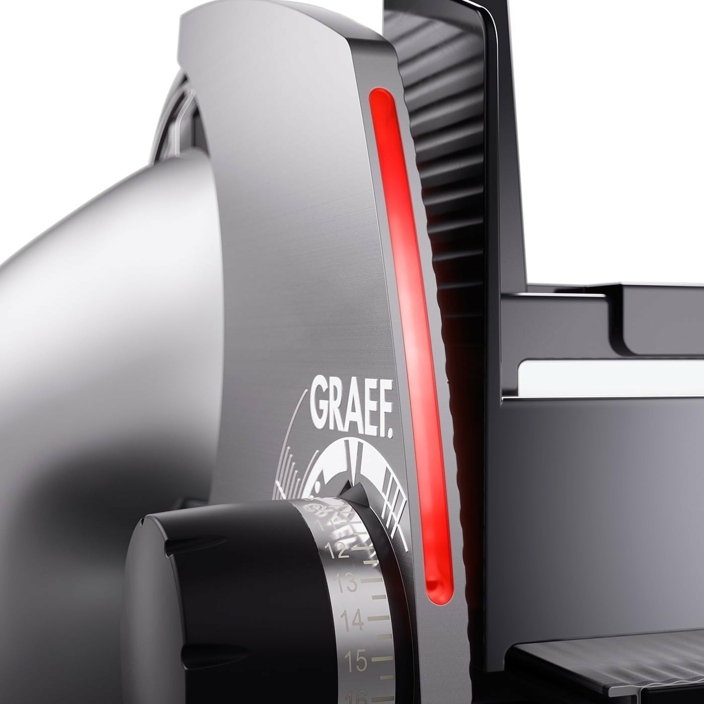 Licht an, Messer auf und volle Schneidepower voraus – im neuen GRAEF Allesschneider SKS 700 stecken 100 Jahre geballte Erfahrung und zahlreiche neue Features, die die Herzen echter Design- und Technikfans höherschlagen lassen. So bringt das einzigartige, noch nie da gewesene Beleuchtungskonzept des formschönen Kraftpakets nicht nur besonders stilvoll Licht ins Küchendunkel, es macht das Arbeiten mit dem neuen Feinschneider auch noch sicher wie nie. Denn ob Abend- oder Morgendämmerung, müde Augen oder einfach nur dunkle Küchenecken – dank der neuen Beleuchtung an Einstellskala und Schneidebereich kann sich keine Zutat mehr vor der unermüdlich schneidenden Vollstahlklinge verstecken. Besonders sicher und smart: die neue LED-Safety-Control. Dank ihr zeigt der neue Alleskönner in der Küche an, ob der Anschlag noch geöffnet ist. Denn während das integrierte Licht zunächst blau leuchtet, wechselt es nach etwa einer Minute auf Rot – eine ständige Erinnerung, dass das scharfe Messer noch offen und einsatzbereit ist. Und damit nicht genug. Eine besondere Feineinstellung im Schnittstärkenbereich von 0–2 mm sorgt dafür, dass das flüsterleise laufende Edelstahlmesser millimetergenau durch Fleisch, Gemüse und Co. gleitet – für Schneideergebnisse ohne Kompromisse!
