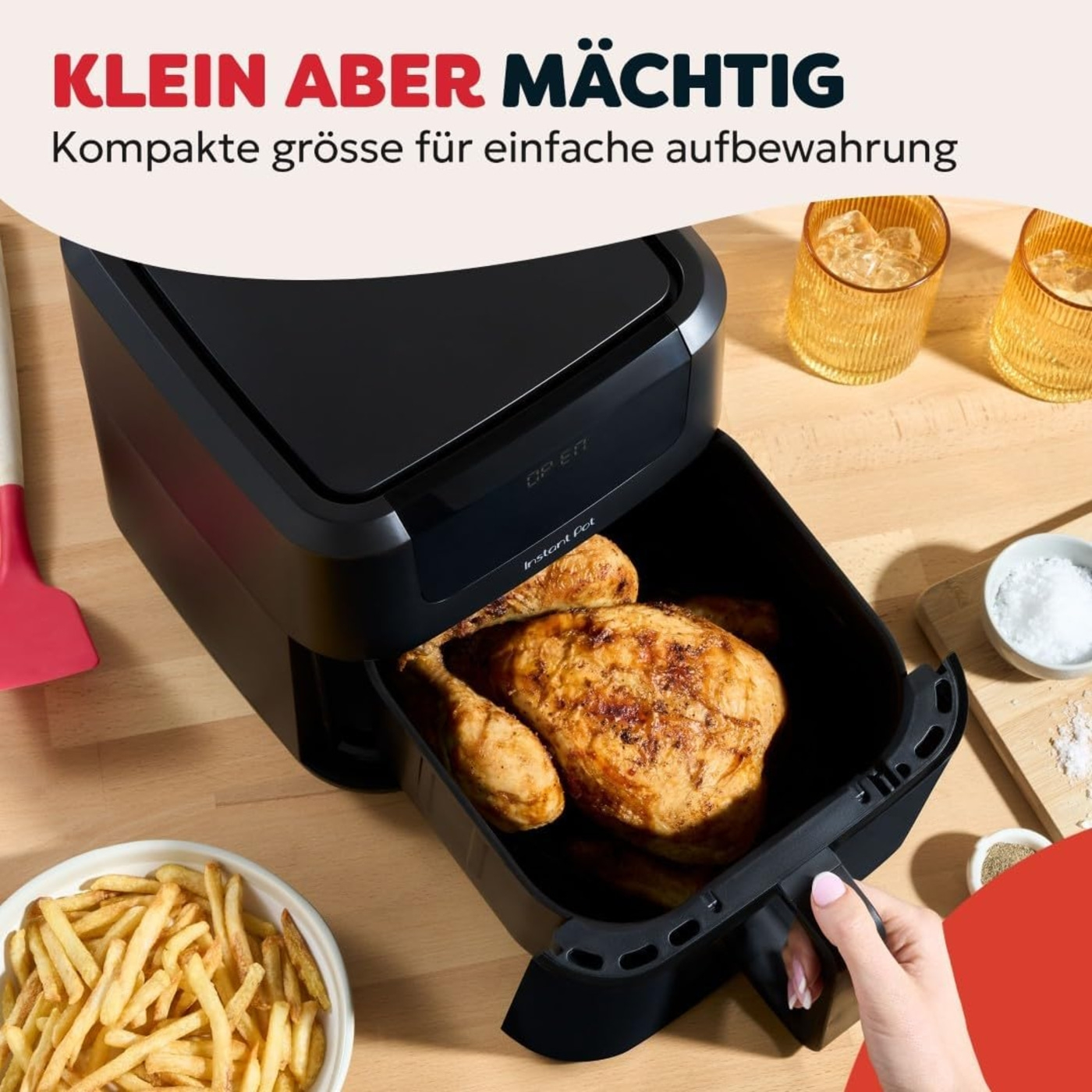 Das ist Ihr kompakter 4-in-1-Küchenbegleiter, der frittiert, backt, aufwärmt und dehydriert. Dank des neuen ClearCook-Fensters können Sie Ihr Essen im Auge behalten, ohne den Zauber zu unterbrechen, und die OdourErase-Filter sorgen dafür, dass Ihre Küche frisch bleibt (damit es nicht nach dem Abendessen von gestern riecht). Seine kompakte Größe spart Platz auf der Arbeitsfläche und schafft dennoch 3-4 Portionen - perfekt für Mahlzeiten zu zweit, für Rendezvous oder für die ganze Familie. Mit anpassbaren Favoriten, einer einfachen, intuitiven Benutzeroberfläche und einem spülmaschinenfesten Tablett macht er Mahlzeiten mühelos.