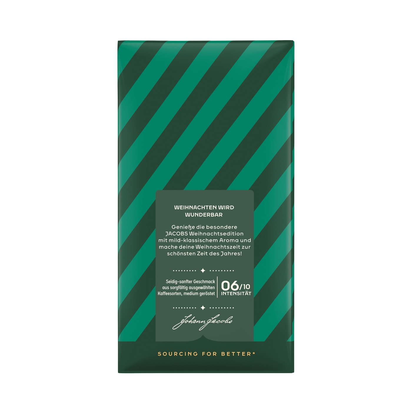 Ho, ho, ho! Genieße die besondere Jacobs Weihnachtsedition mit ihrem mild-klassischen Aroma und mache deine Festtage zur schönsten Zeit des Jahres. Ein seidig-sanfter Geschmack aus sorgfältig ausgewählten Kaffeesorten, schonend mittel geröstet.