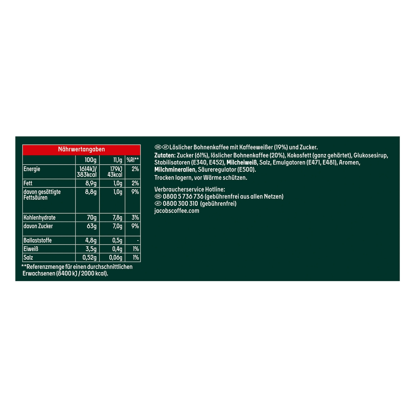 - Zutaten: Zucker (61%), löslicher Bohnenkaffee (20%), Kokosfett (ganz gehärtet), Glukosesirup, Stabilisatoren (E340, E452), Milcheiweiß, Salz, Emulgatoren (E471, E481), Aromen, Milchmineralien, Säureregulator (E500).