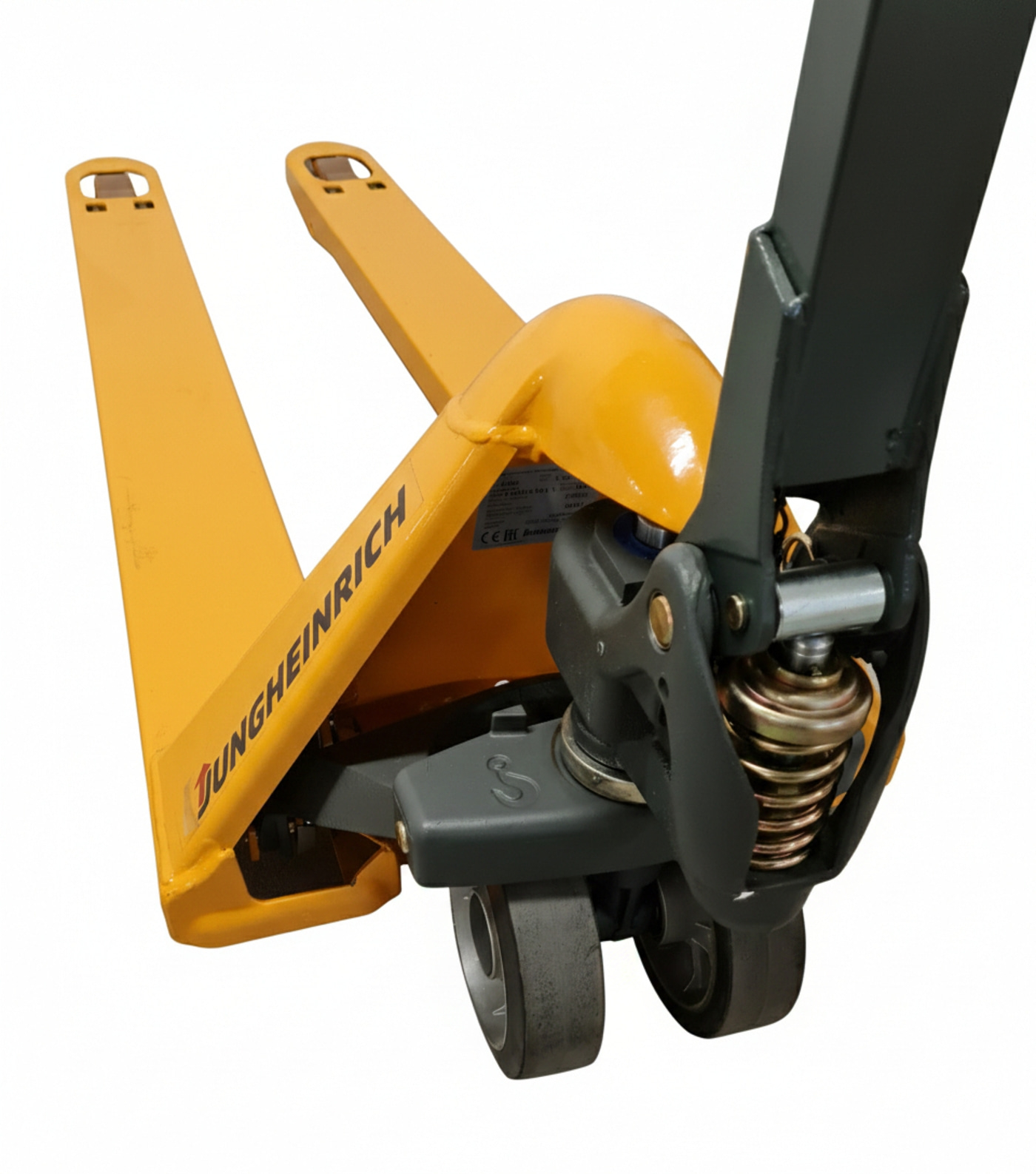 Die Lenkräder aus Vollgummi in Kombination mit Tandem-Gabelrollen aus Polyurethan ermöglichen hochwertiges, komfortables und geräuscharmes Fahren. Tandemrollen gewährleisten besonders bei Bodenunebenheiten Stabilität und reduzieren die Punktbelastung. Abgerundete Gabelspitzen und Einlaufrollen an der Gabelunterseite erleichtern Ihnen das Einfahren in die Paletten.