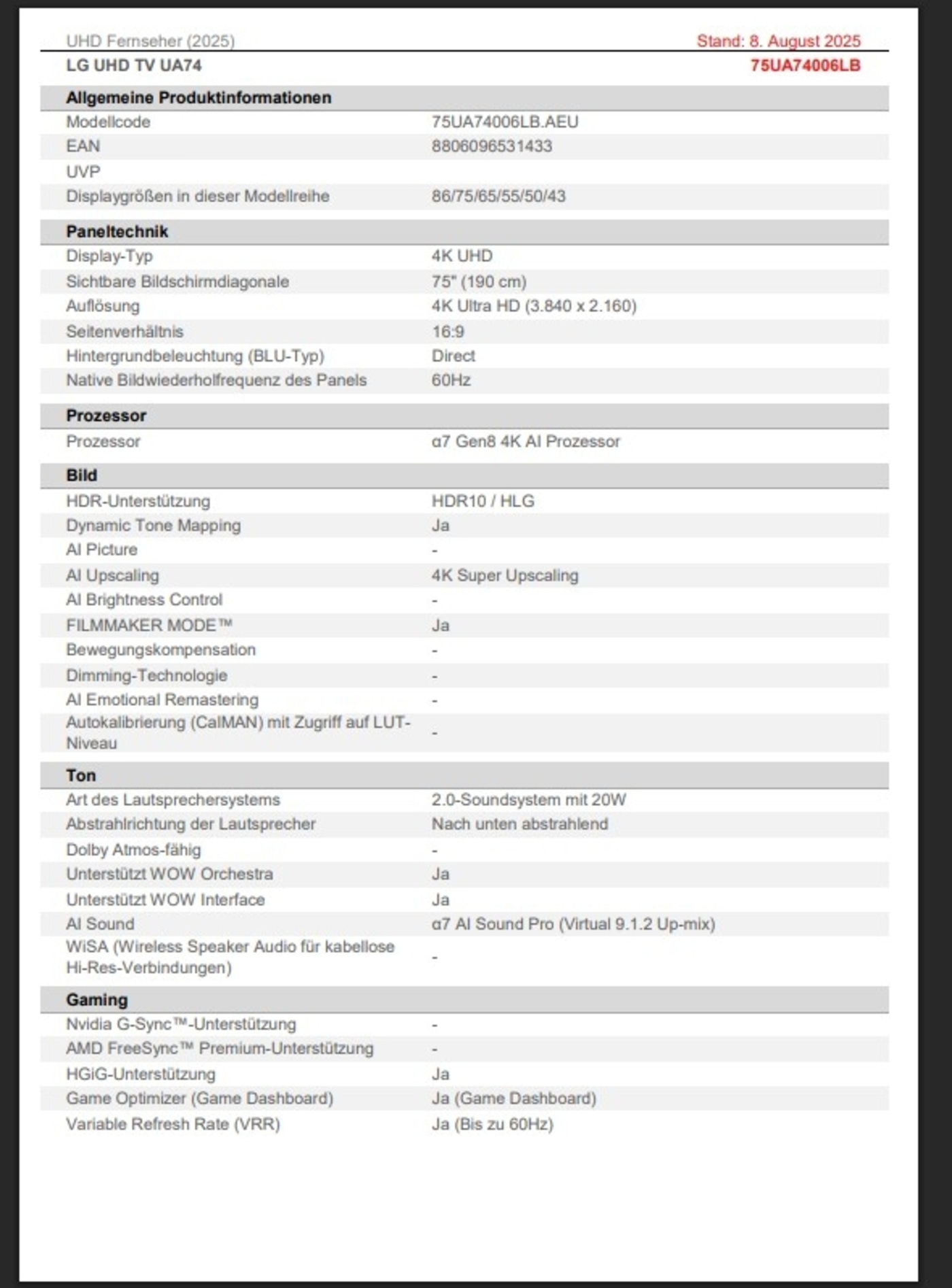 LG TV 75UA74006LB LED-Fernseher 189 cm/75 Zoll 4K Ultra HD Smart-TV 60 Hz B-WARE
