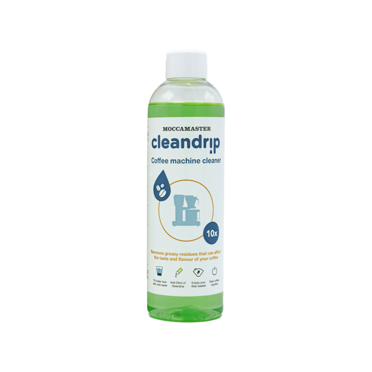 Cleandrip ist das Reinigungsprodukt von Moccamaster, das speziell entwickelt wurde, um Ihr Kaffeeerlebnis zu verbessern und die Lebensdauer Ihrer geliebten Moccamaster Kaffeemaschine zu verlängern. Mit einer Flasche Cleandrip können Sie Ihre Kaffeemaschine bis zu zehn Mal reinigen.