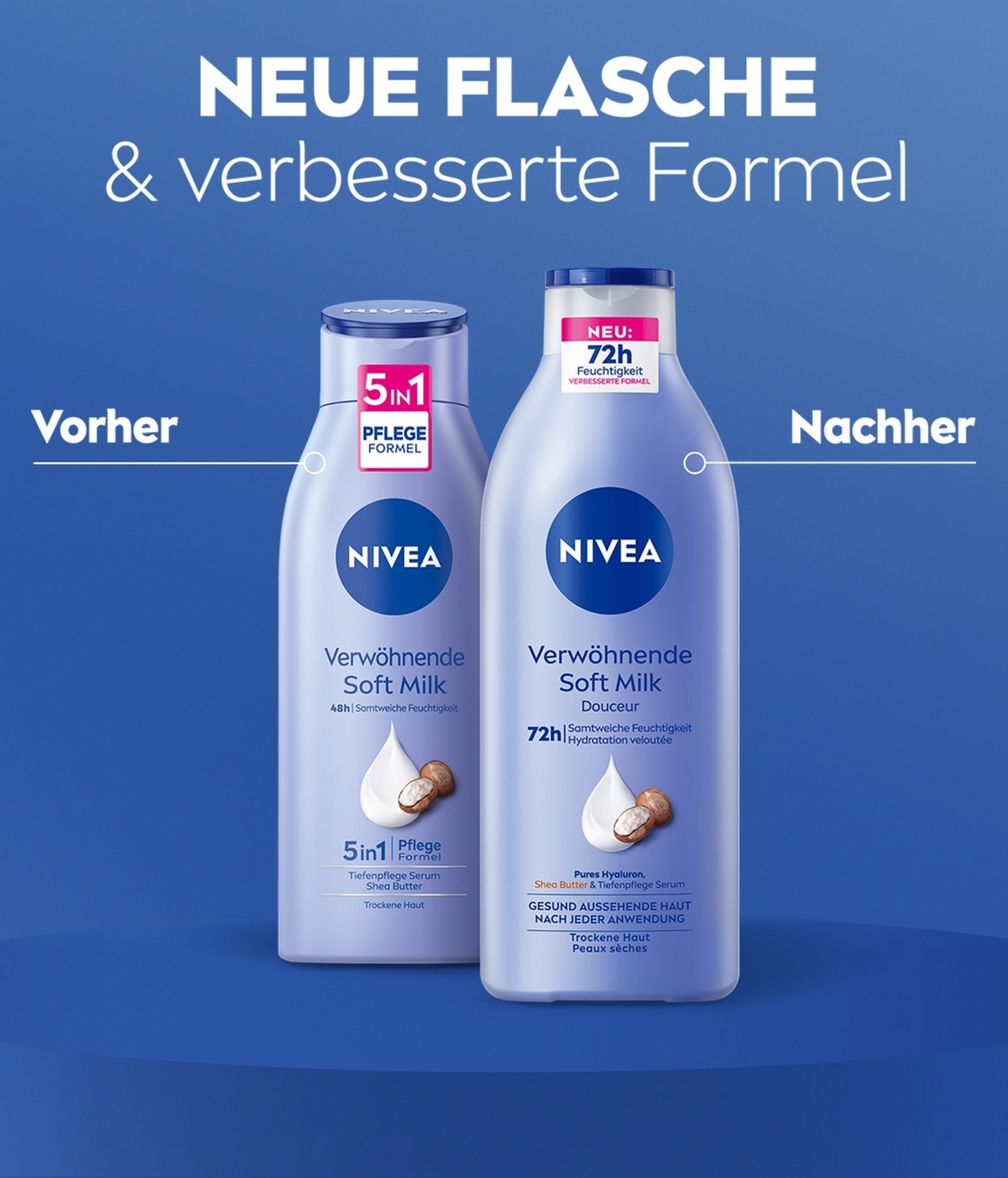 Die NIVEA Verwöhnende Soft Milk mit purem Hyaluron, Shea Butter & Tiefenpflege Serum spendet 72h intensive Feuchtigkeit. Für gesund aussehende Haut nach jeder Anwendung.