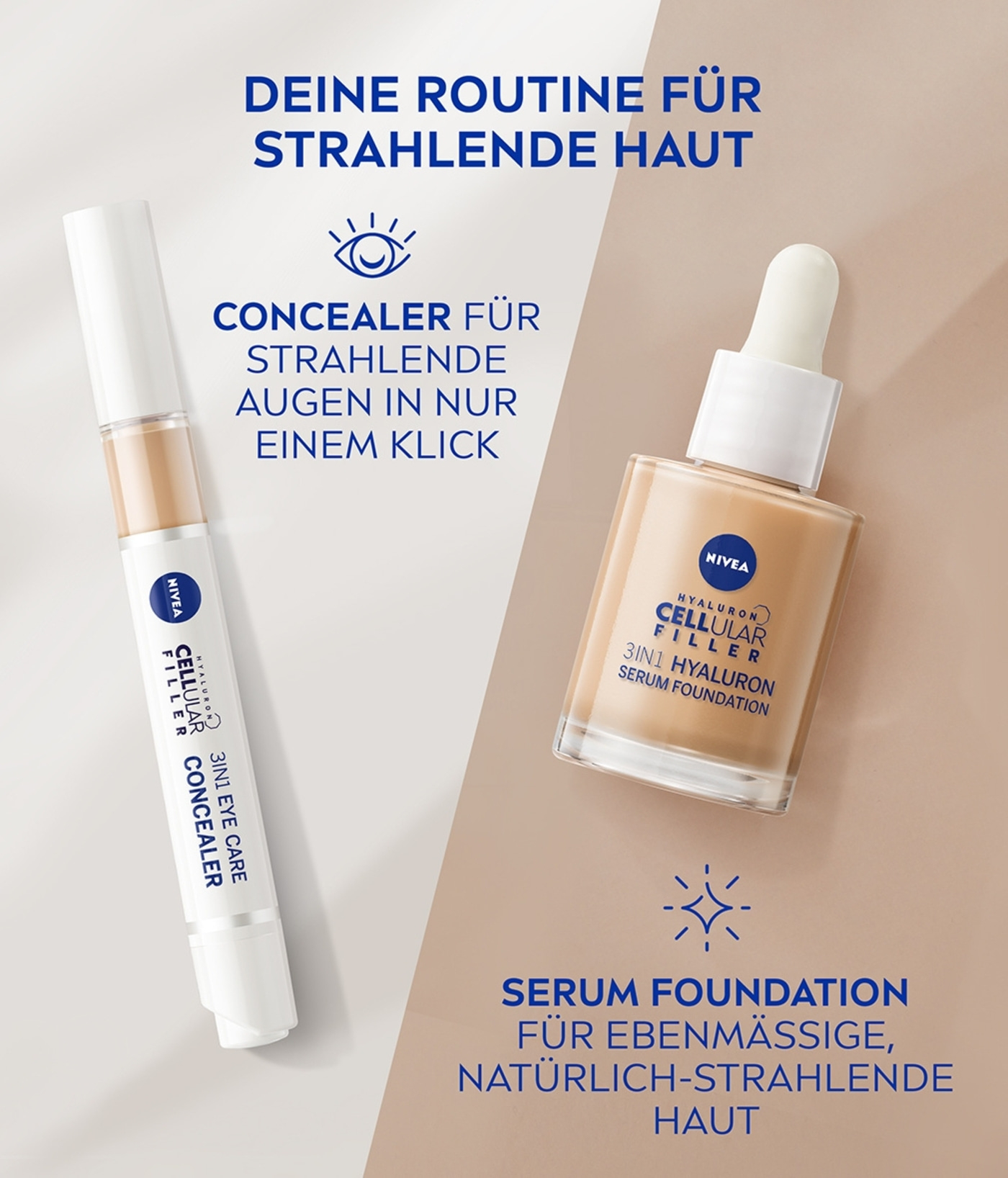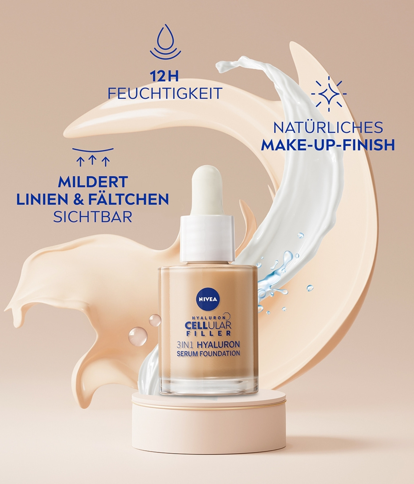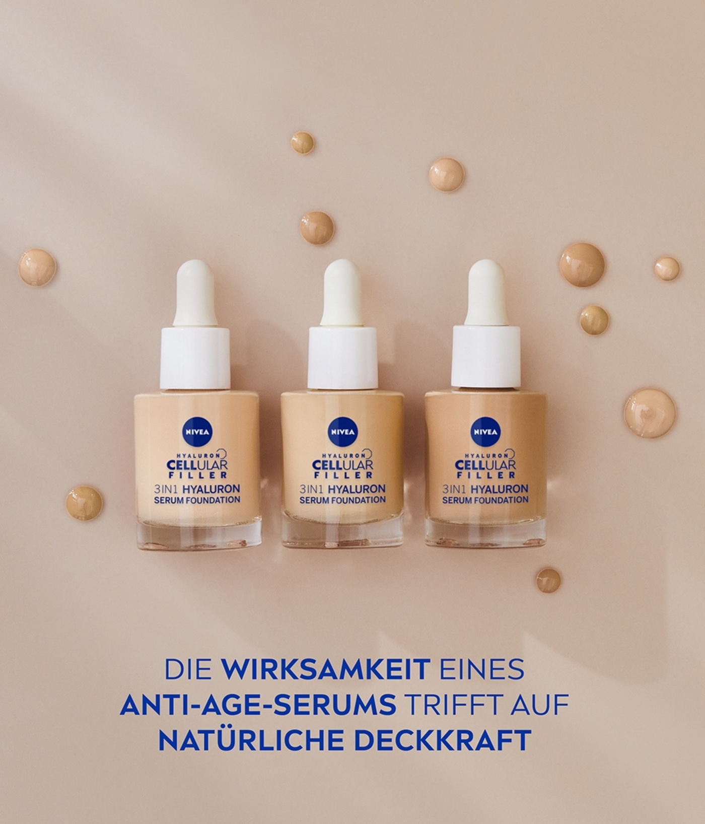 Glow Foundation trifft auf hochwirksames Serum: Die NIVEA 3in1 Hyaluron Serum Foundation verleiht einen natürlich-ebenmäßigen Teint, spendet mit Avocado Öl 12h Feuchtigkeit & mildert dank Hyaluron Linien & Fältchen.