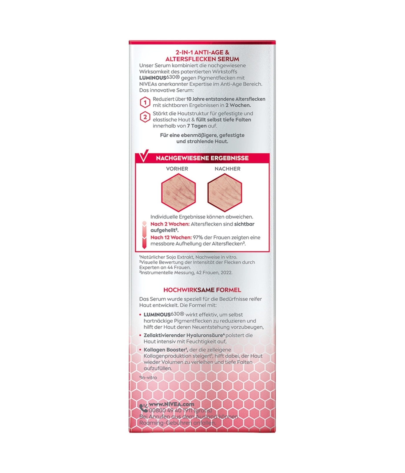 NIVEA LUMINOUS630 2-IN-1 ANTI-AGE & ALTERSFLECKEN SERUM - reduziert über 10 Jahre entstandene Altersflecken mit sichtbaren Ergebnissen in 2 Wochen. Stärkt die Hautstruktur für gefestigte und elastische Haut & füllt selbst tiefe Falten auf. Für eine ebenmäßigere und strahlende Haut.