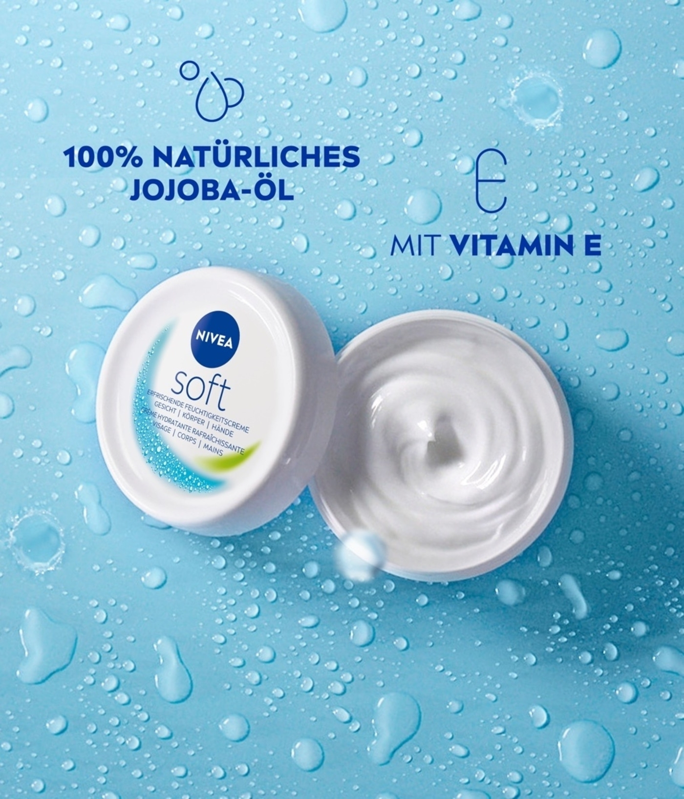 Die Creme für einen maximalen Frische-Kick für die tägliche Anwendung. Die neue, verbesserte Formel mit leichter Textur spendet intensive Feuchtigkeit, pflegt und erfrischt die Haut: NIVEA Soft.