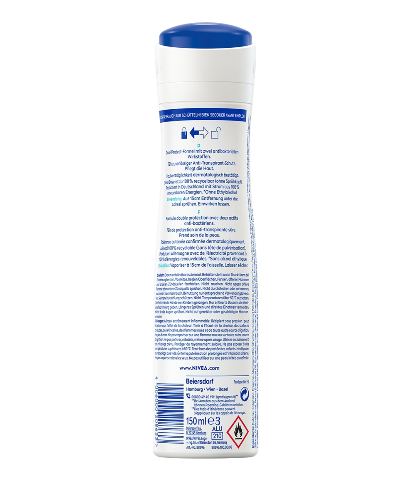 NIVEA Dry Active Deo Spray sorgt mit seiner Dual Protect Formel mit zwei antibakteriellen Wirkstoffen für Komfort und Trockenheit. 72h Anti-Transpirant-Schutz, der die Haut pflegt.