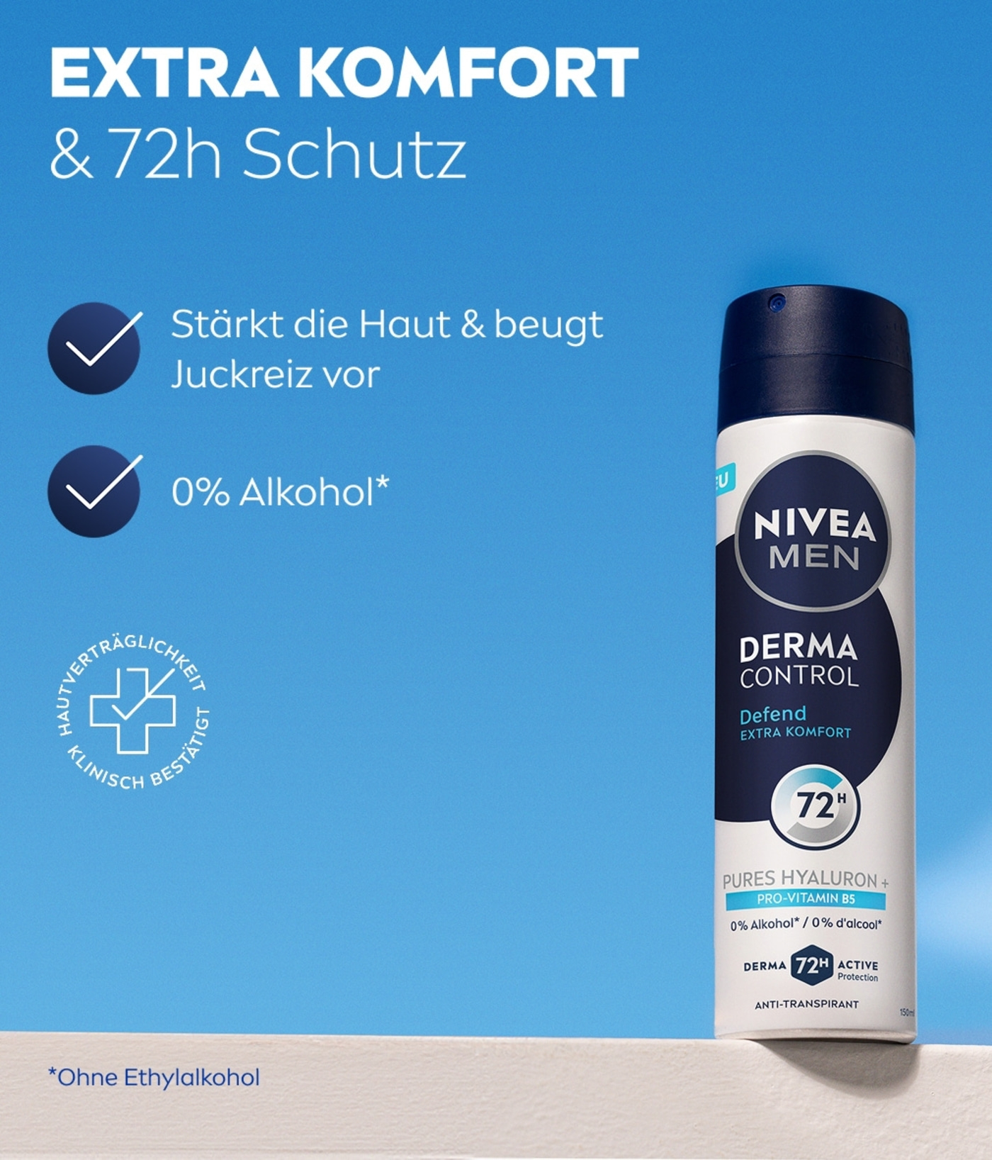 NIVEA MEN Derma Control Defend sorgt für ein angenehmes Hautgefühl mit 72h Anti-Transpirant-Schutz. Die Formel mit purem Hyaluron und Pro-Vitamin B5 stärkt und pflegt die Haut und lindert Juckreiz.