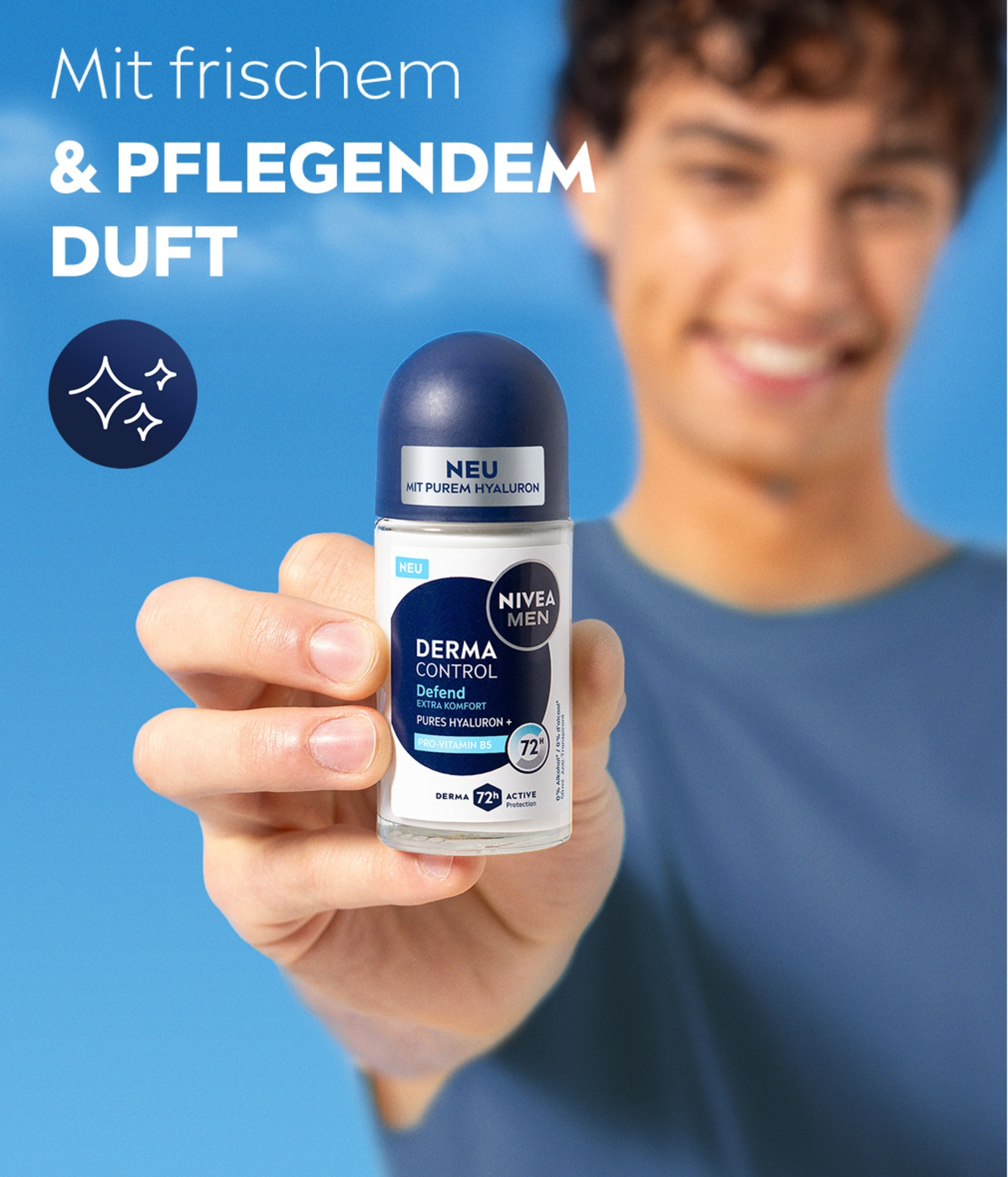 NIVEA MEN Derma Control Defend Roll-On schützt mit purem Hyaluron und Pro-Vitamin B5 vor Irritationen, stärkt die Haut und beugt Juckreiz vor. 72h Anti-Transpirant-Schutz, der deine Haut pflegt.