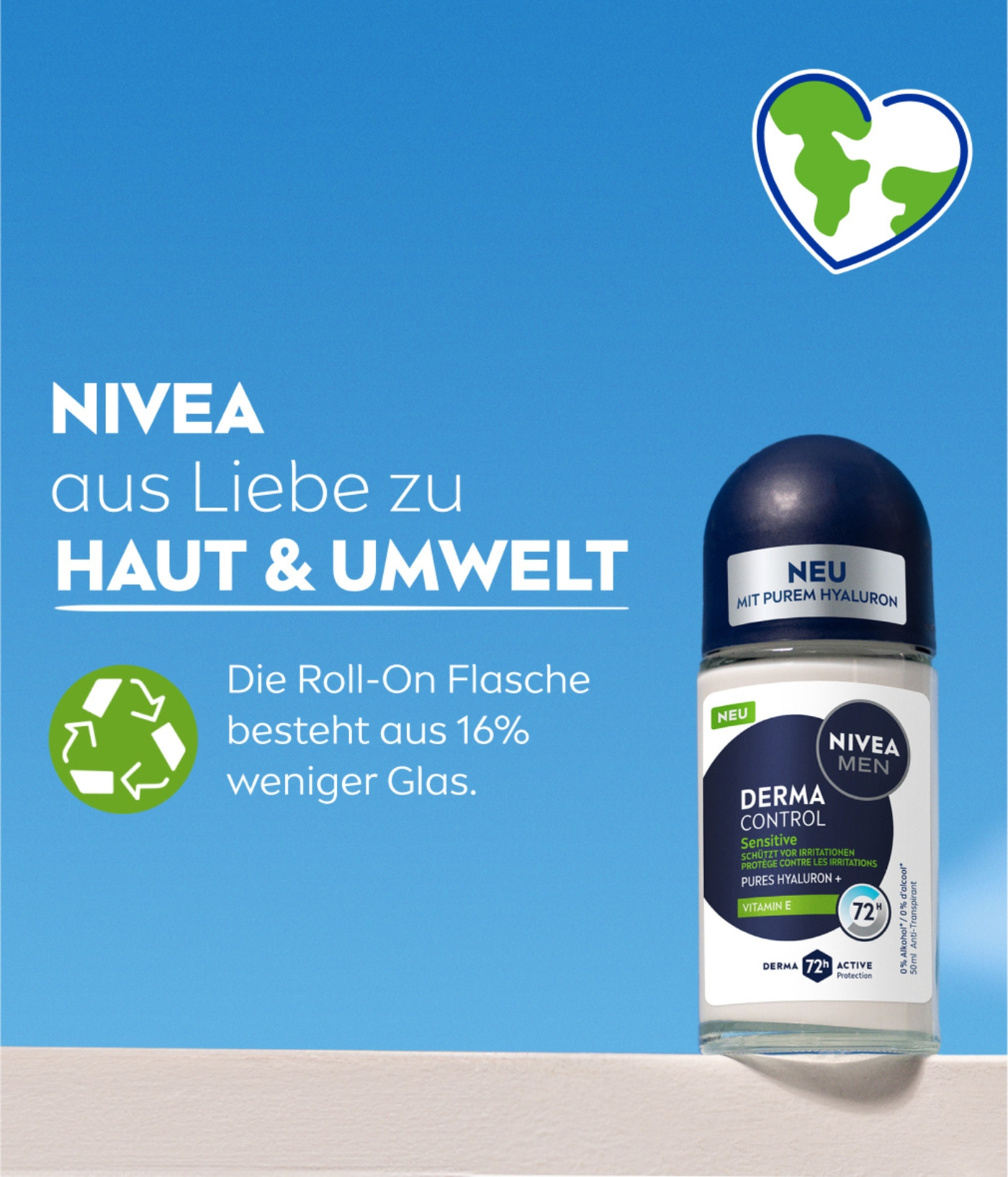 NIVEA MEN Derma Control Sensitive Roll-On bietet 72 Stunden zuverlässigen Anti-Transpirant-Schutz und pflegt empfindliche Haut mit purem Hyaluron und Vitamin E, um Hautreizungen zu vermeiden.