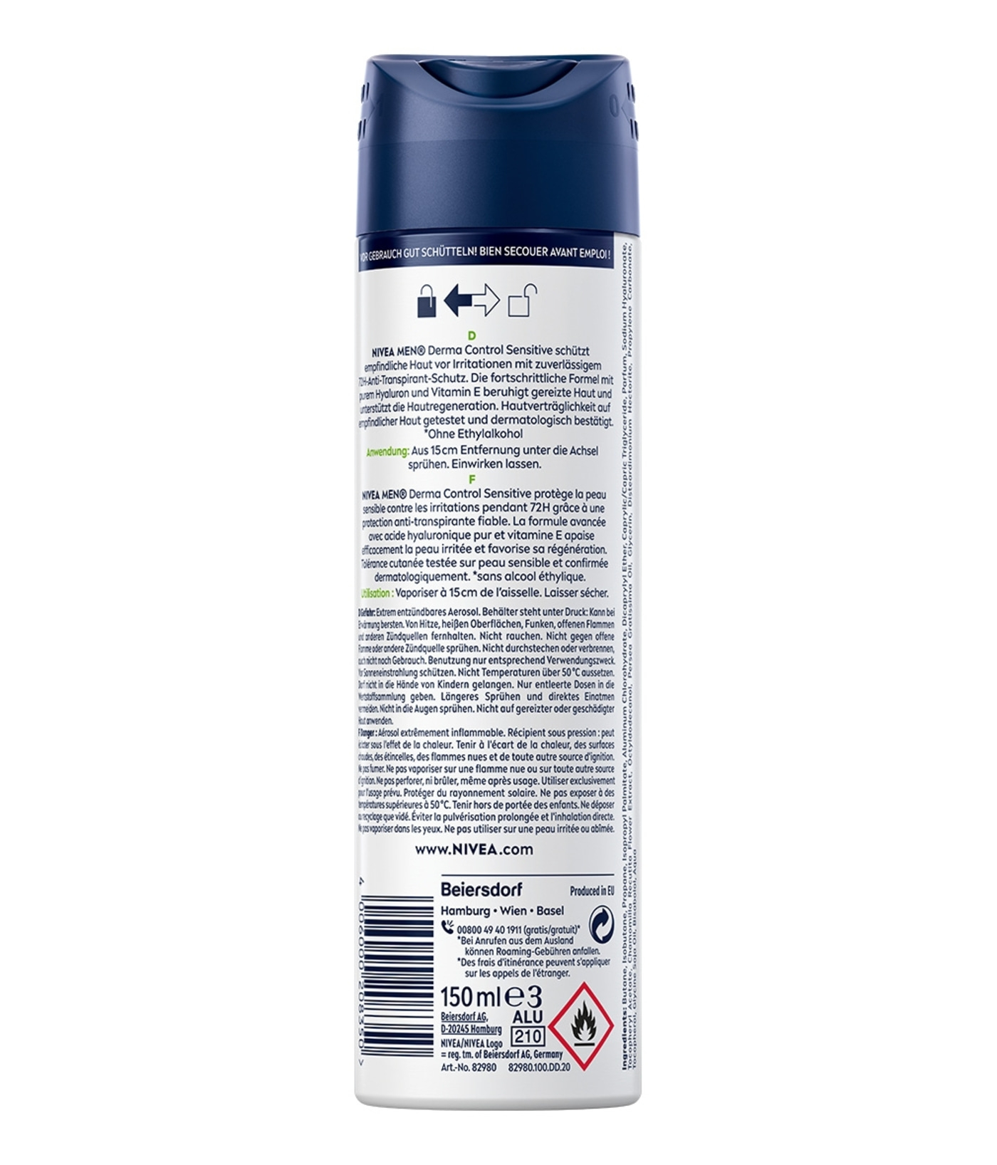 NIVEA MEN Derma Control Sensitive Deo Spray schützt mit purem Hyaluron und Vitamin E vor Irritationen, beugt Hautreizungen vor und bietet 72h zuverlässigen Anti-Transpirant-Schutz bei sanfter Pflege.