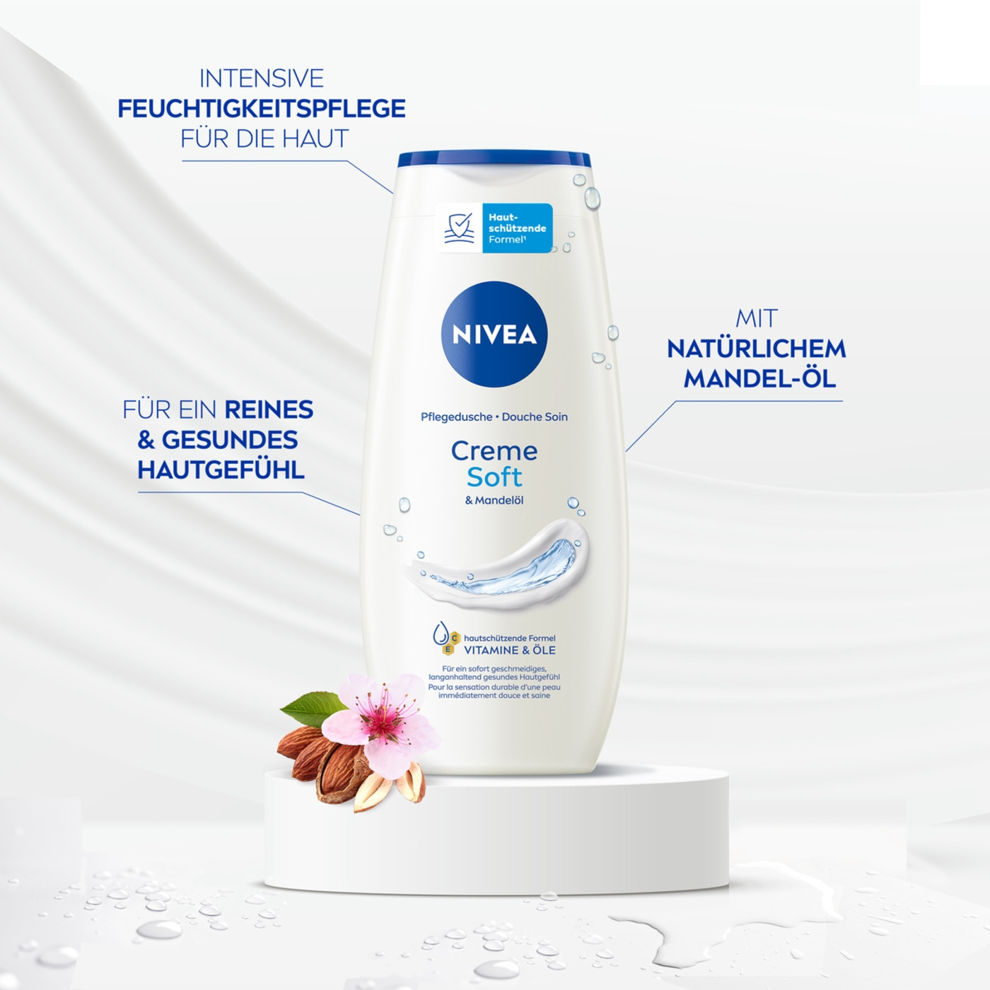 Spüre, wie die seidige Cremedusche mit wertvollen Ölen, Mandel-Öl und Vitaminen C & E deine Haut sanft pflegt. Genieße den samtweichen Schaum und den milden Duft: Creme Soft Pflegedusche.