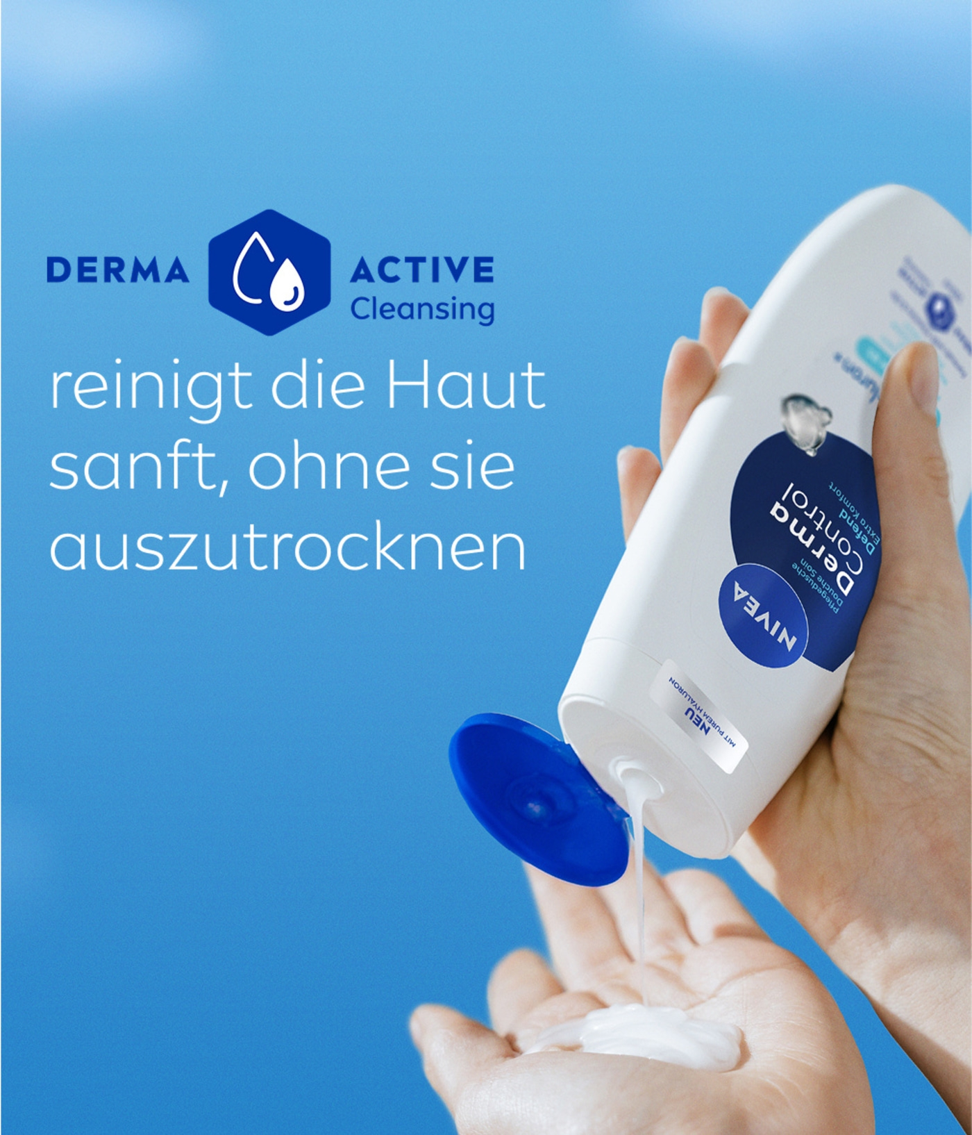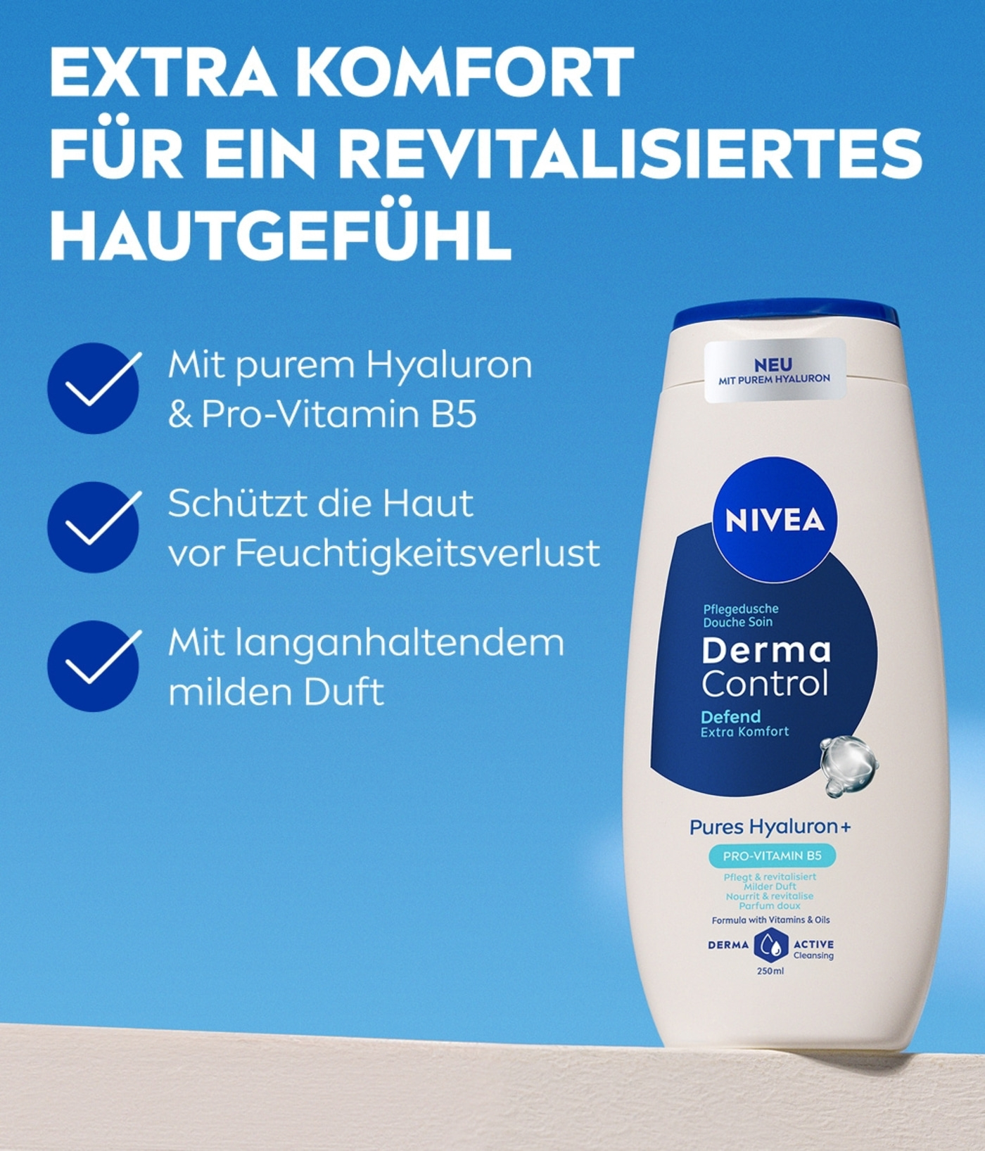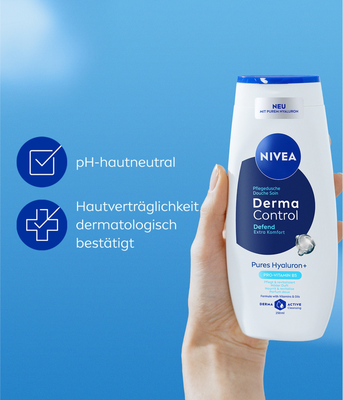 NIVEA Derma Control Defend Pflegedusche mit purem Hyaluron und Pro-Vitamin B5 revitalisiert die Haut, reinigt sie sanft und unterstützt ihre Widerstandskraft gegen Irritationen und Trockenheit.