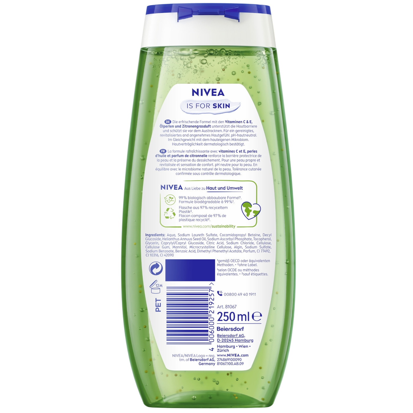 Erfrischendes Duschgel, das Ihre Haut pflegt. Angereichert mit Vitamin C, E und Ölperlen schützt dieses Duschgel Ihre Haut und pflegt sie auf natürliche Weise für ein glattes und erfrischtes Hautgefühl: NIVEA Lemongrass & Oil Duschgel.
