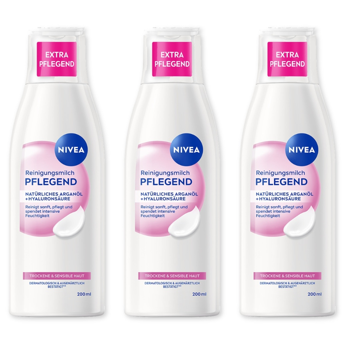 NIVEA Pflegende Reinigungsmilch 3 x 200ml mit Arganöl und Hyaluronsäure