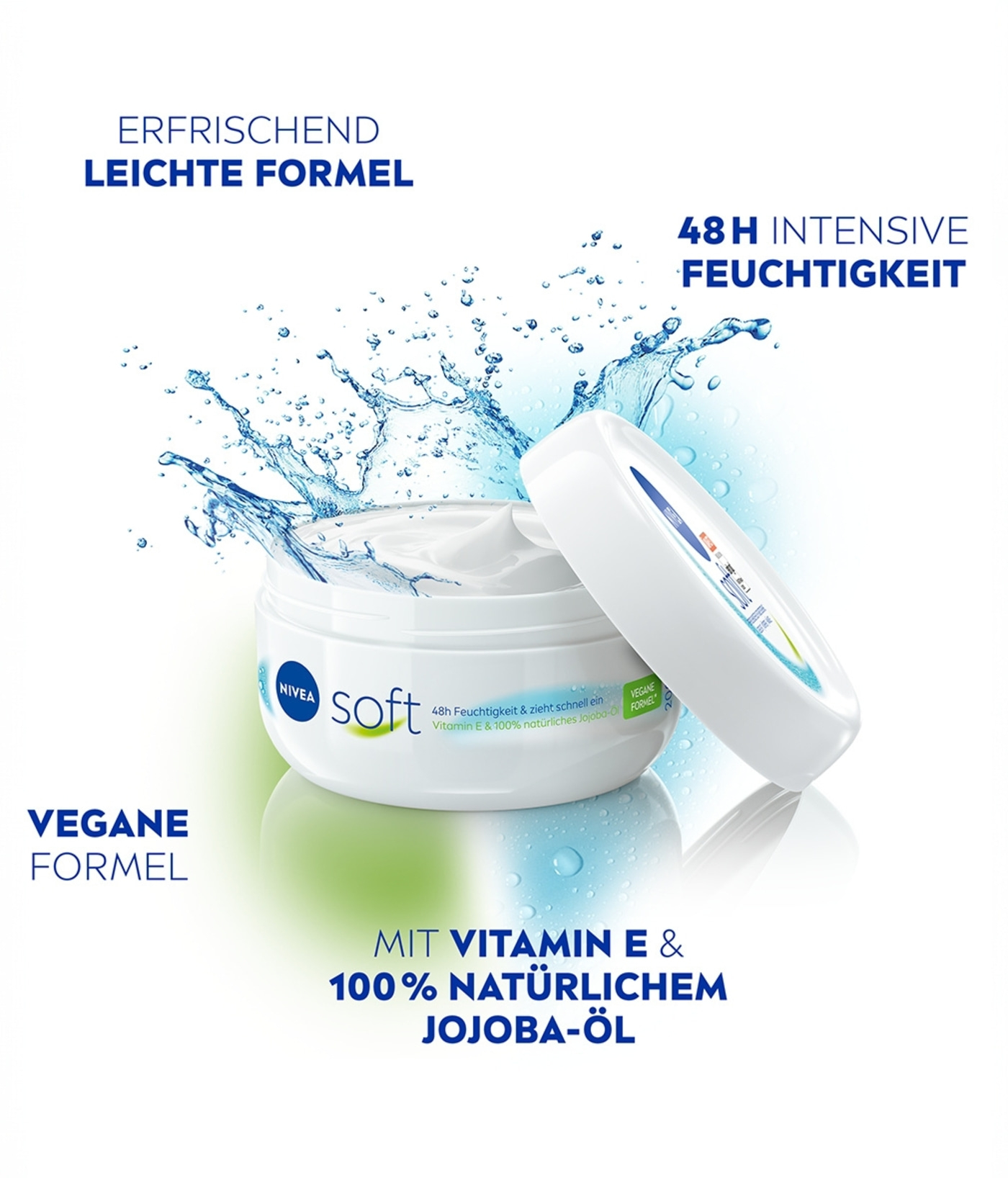 Die Creme für einen maximalen Frische-Kick für die tägliche Anwendung. Die vegane Formel* mit leichter Textur spendet intensive Feuchtigkeit, pflegt und erfrischt die Haut: NIVEA Soft. (*ohne Inhaltsstoffe tierischen Ursprungs)