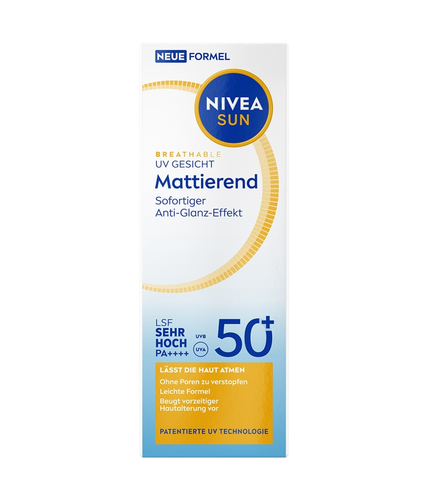 NIVEA SUN Breathable UV Gesicht Mattierend LSF 50+ bekämpft lichtbedingte Hautalterung, ohne die Poren zu verstopfen. Hat einen 12h+ Anti-Glanz-Effekt und reduziert die Sichtbarkeit der Poren.