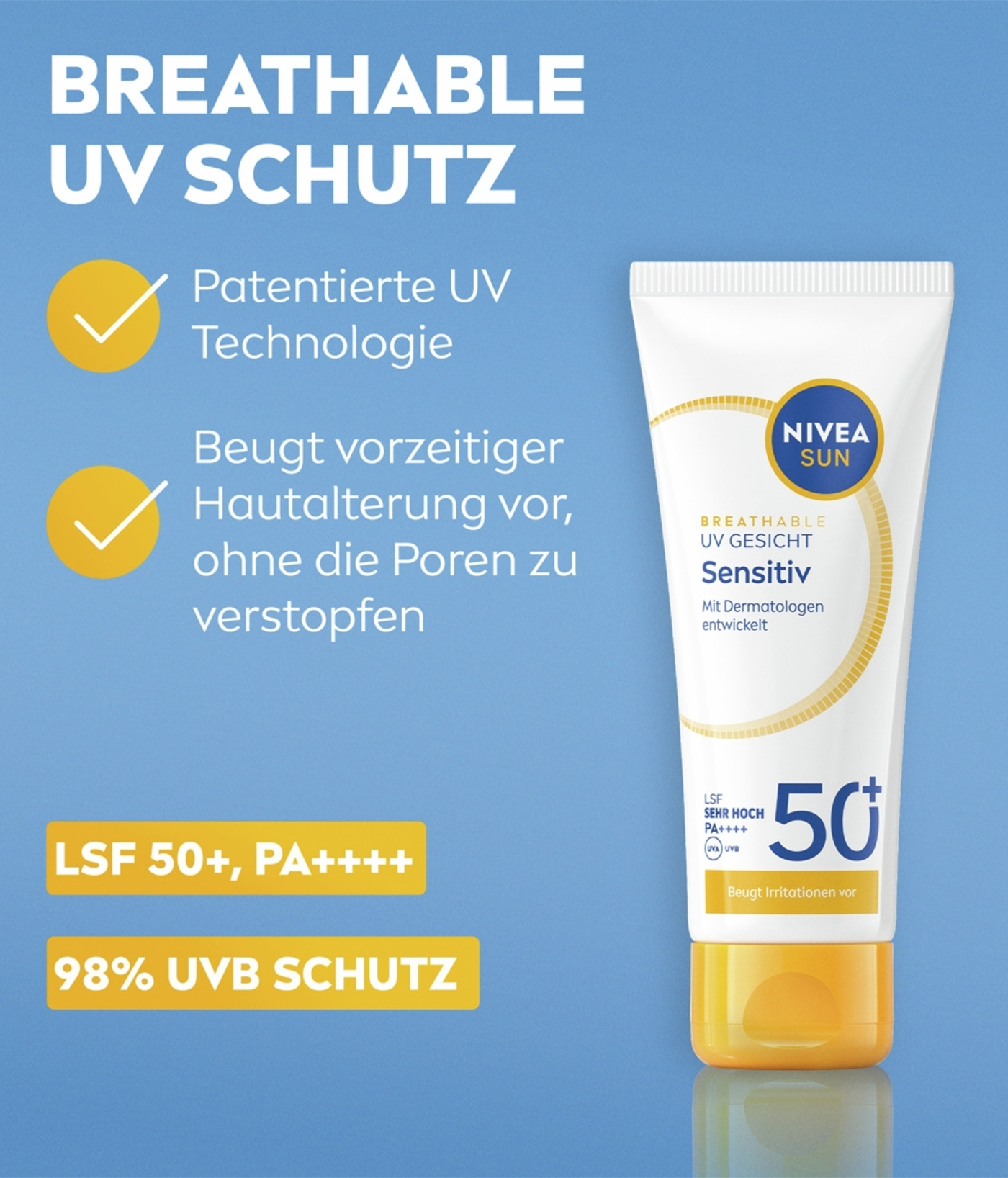 NIVEA SUN Breathable UV Gesicht Sensitive LSF 50+ beugt vorzeitiger Hautalterung vor, ohne die Poren zu verstopfen. Spendet empfindlicher Haut Feuchtigkeit und ist parfümfrei.