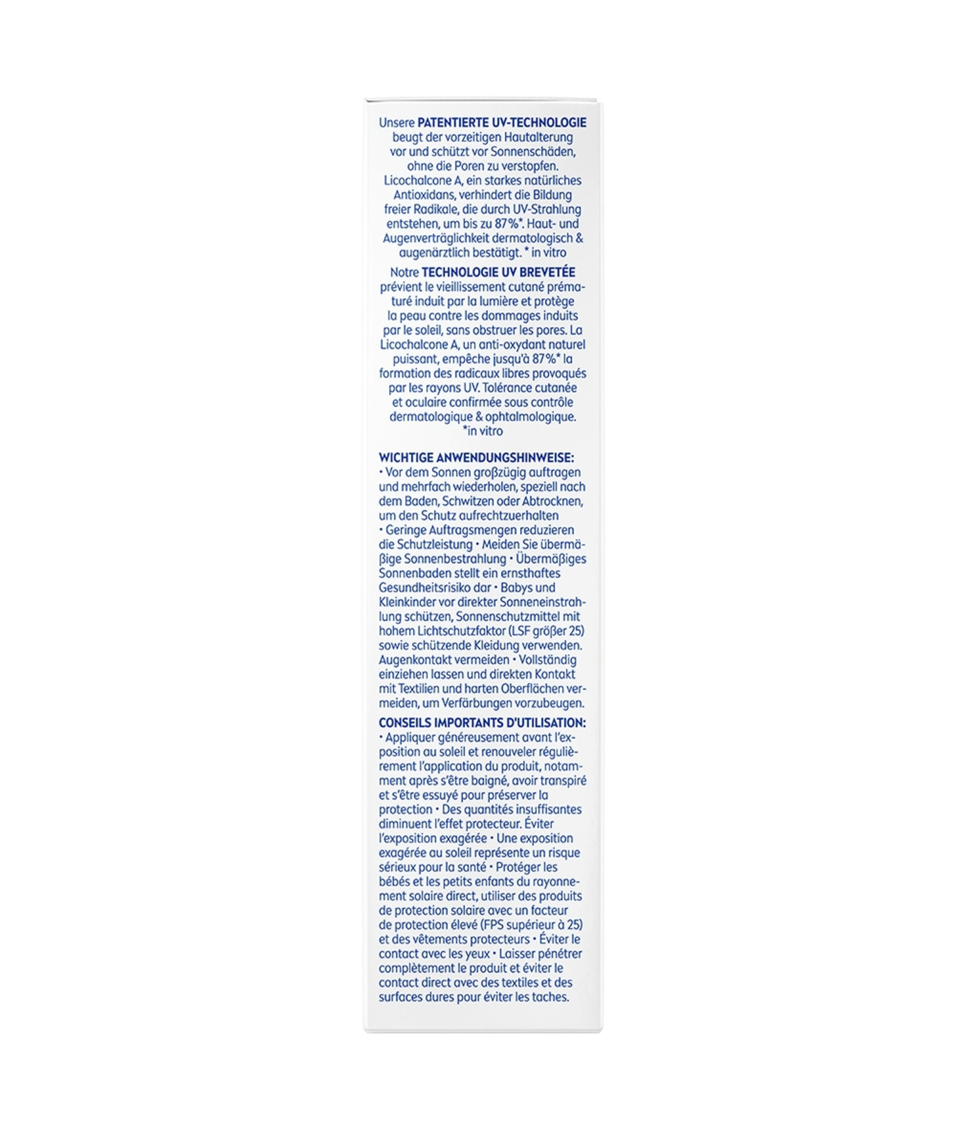 Wichtige Anwendungshinweise: Vor dem Sonnen großzügig auftragen und mehrfach wiederholen, speziell nach dem Baden, Schwitzen oder Abtrocknen, um den Schutz aufrechtzuerhalten. Geringe Auftragsmengen reduzieren die Schutzleistung. Meiden Sie übermäßige Sonnenbestrahlung. Übermäßiges Sonnenbaden stellt ein ernsthaftes Gesundheitsrisiko dar. Babys und Kleinkinder vor direkter Sonneneinstrahlung schützen, Sonnenschutzmittel mit hohem Lichtschutzfaktor (LSF größer 25) sowie schützende Kleidung verwenden. Augenkontakt vermeiden. Vollständig einziehen lassen und direkten Kontakt mit Textilien und harten Oberflächen vermeiden, um Verfärbungen vorzubeugen.