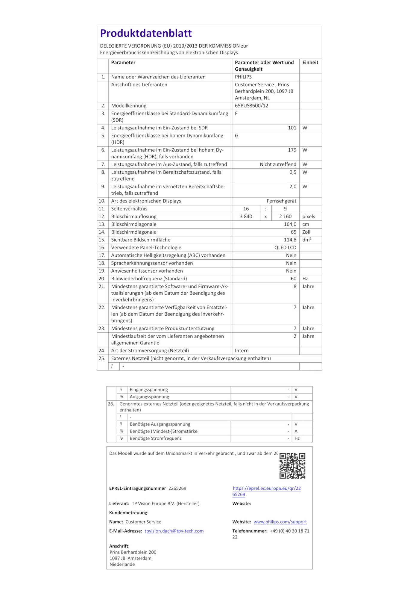 - Energieverbrauch im Ein-Zustand bei Standard-Dynamikumfang (SDR) pro 1000 h: 101 kWh