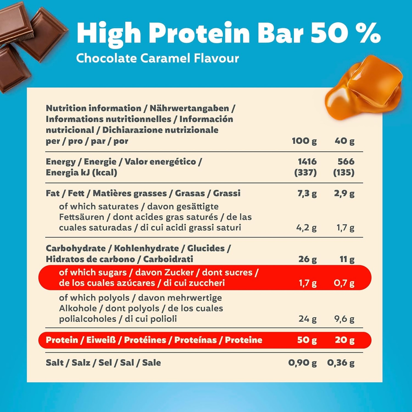 - Verkehrsbezeichnung: Eiweißriegel mit Karamellgeschmack, überzogen mit Milchschokolade, mit Süßungsmitteln.