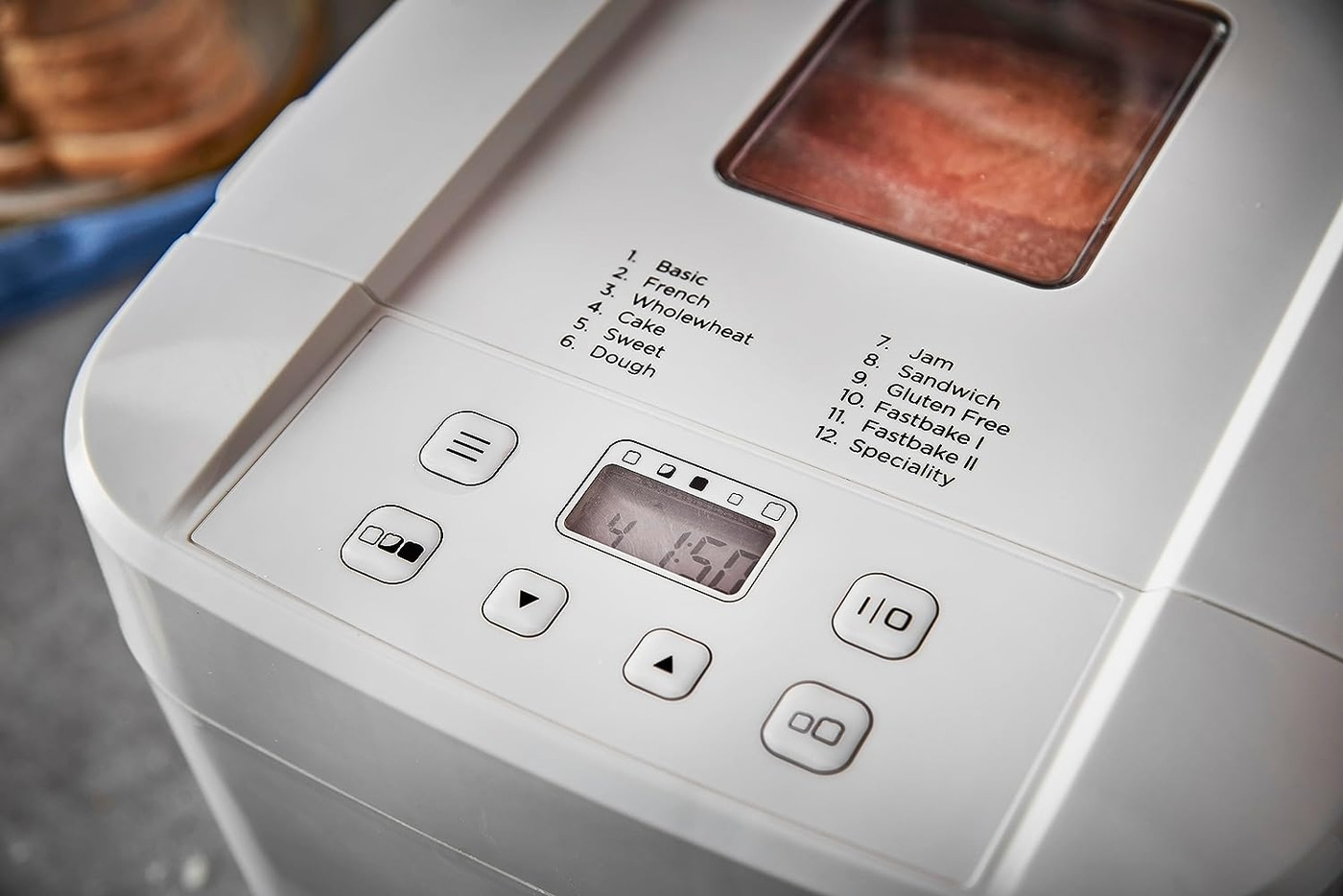 - 12 Programme: Standard/ French/ Vollkorn/ Kuchen/ Sweet/ Teig/ Marmelade/ Sandwich/ Glutenfrei/ Schnellbackfunktion 1/ Schnellbackfunktion 2/ Spezialität