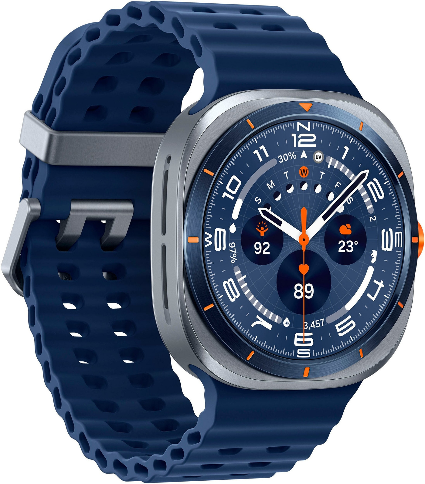 Die Galaxy Watch Ultra (2025) ist in Titanium Gray, Titanium Silver, Titanium White und jetzt ganz neu auch in Titanium Blue erhältlich. Diese neue Option erweitert das atemberaubende Farbspektrum, das zusammen mit den dazu passenden vielseitigen Armbändern den sportlichen und mutigen Stil der Galaxy Watch Ultra (2025) verkörpert.