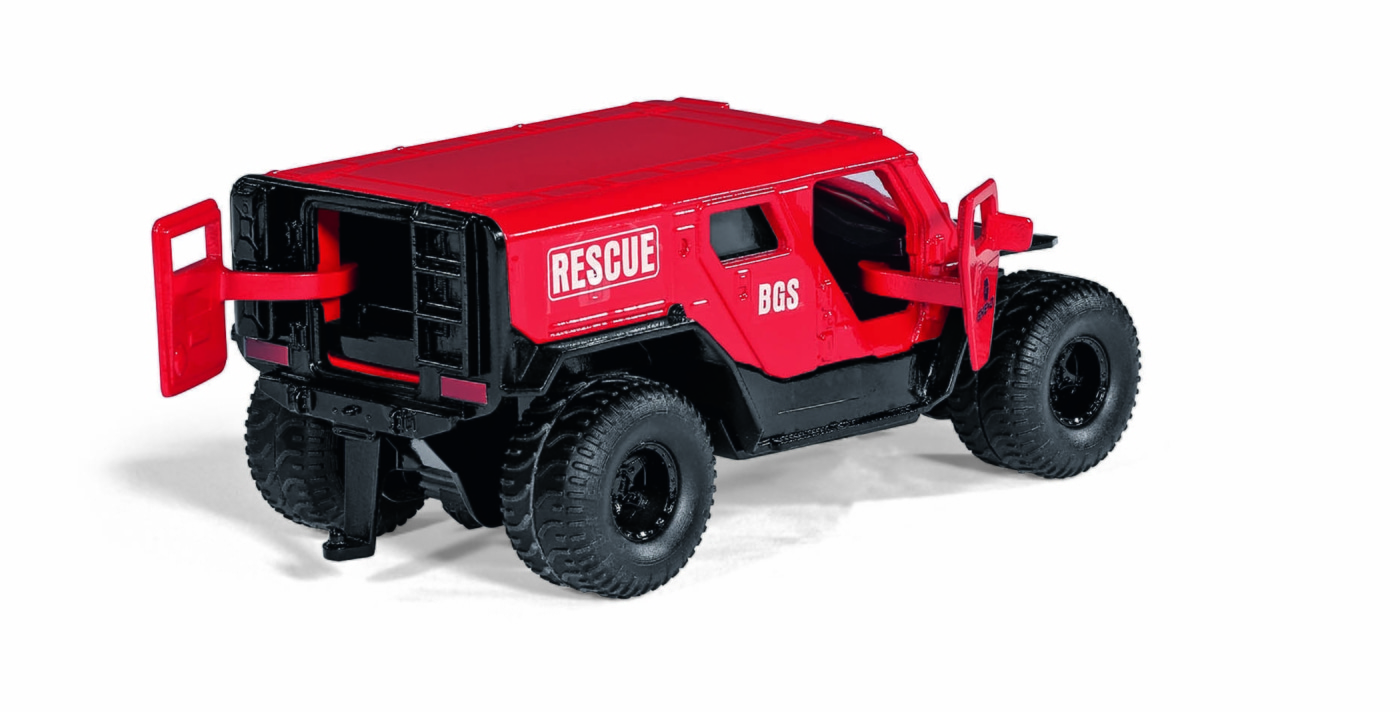 Dieser Rettungswagen braucht keine Sirene, kein Signallicht. Angetrieben von einem großen V8-Motor bahnt sich der futuristisch gestylte Monstertruck GHE-O Rescue seinen Weg. Mit den gefederten Vorder- und Hinterachsen und den großen Ballonreifen ist auch die Miniatur für unwegsames Terrain bestens ausgestattet. Die Reifen lassen sich auch abnehmen. Bei der Miniatur im Maßstab 1:50 können die Fronttüren und die Hecktür geöffnet werden, damit die Rettungstrage mit der verletzten Person ins Fahrzeug eingeschoben werden kann. Rettungsmission geschafft!