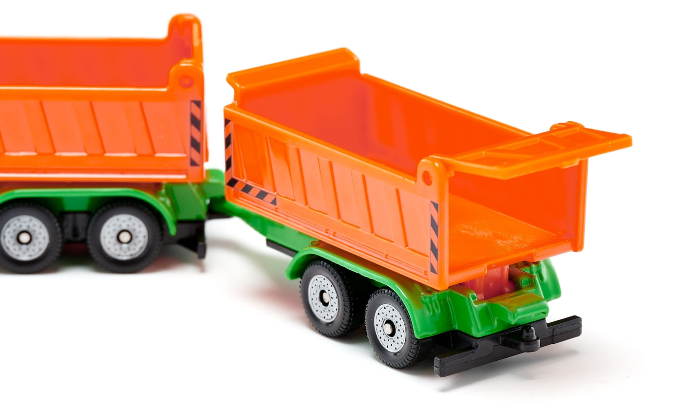 Bauschutt, Erdreich, Kies oder Sand: Die Lastwagen mit Kippmulde sind die Alleskönner auf jeder Baustelle. Angetrieben von einem starken Motor zieht die Kippmulde einen Kippanhänger mit Tandemachse. Die Mulden können mit den SIKU Baggern und Radladern randvoll beladen werden. Ein Hupzeichen und die robusten Fahrzeuge aus Metall und Kunststoff fahren langsam an. Am Abladeort angekommen, können die Mulden gekippt und der Anhänger angekuppelt werden, um an einem zweiten Abladeort abzukippen. Zudem lassen sich die Klappen der Mulden öffnen.