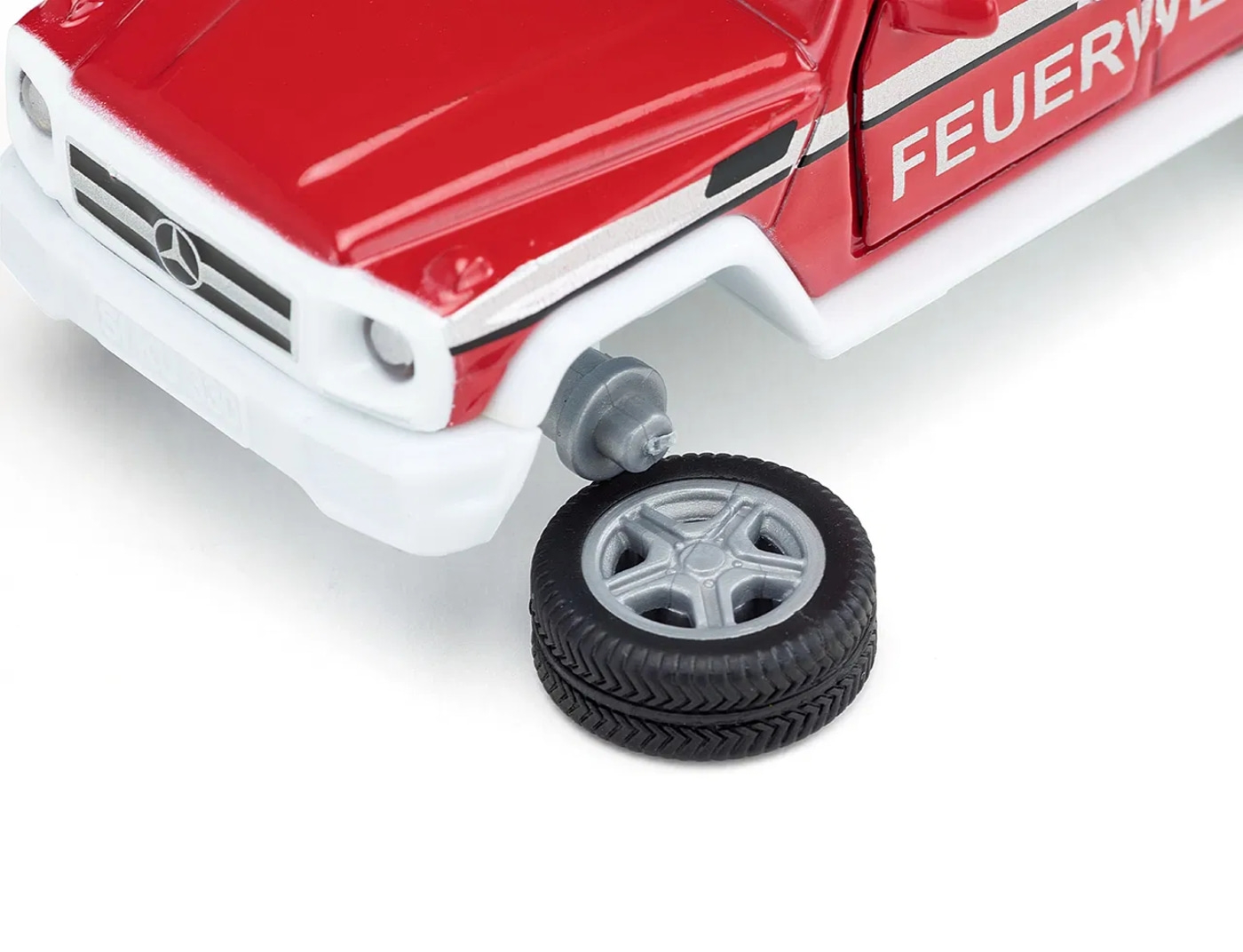 Die Urform des Geländewagens lebt im Mercedes G-Modell auch 40 Jahre nach der Einführung weiter. In der Variante AMG G65 mit V12-Bi-Turbo-Motor und 630 PS besonders leistungsstark. In Feuerwehr-Optik und mit Rundumleuchten auf dem Dach ist das Fahrzeug auch mit ausgeschaltetem Blaulicht nicht zu übersehen. Aber auch in schwerem Gelände ist die Einsatzleitung schnell zur Stelle. Bei der Miniatur im Maßstab 1:50 lassen sich die Fronttüren und die Hecktür öffnen, zudem können alle vier Räder und das Ersatzrad gewechselt werden. Mit der Anhängerkupplung lassen sich auch schwere Lasten ziehen.