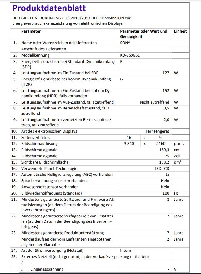 - Leistungsaufnahme im Ein-Zustand bei Standard-Dynamikumfang (SDR): 127 W