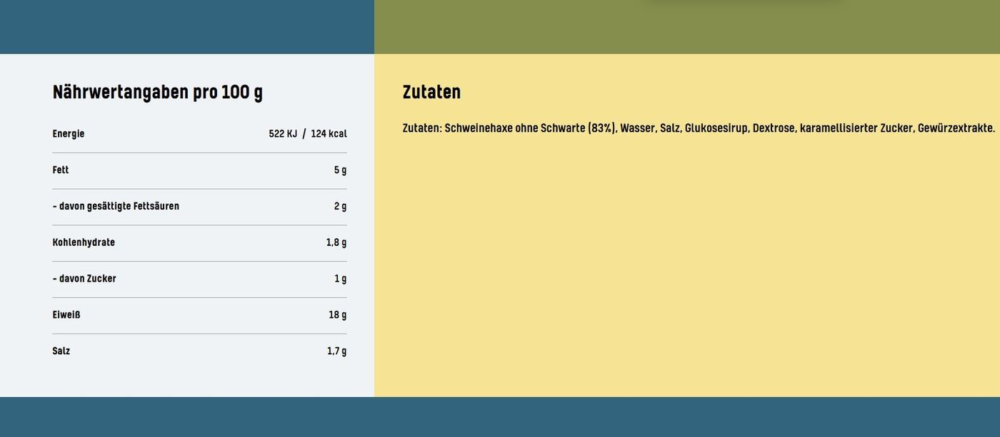 - Zutaten: Schweinehaxe ohne Schwarte (83%), Wasser, Salz, Glukosesirup, Dextrose, karamellisierter Zucker, Gewürzextrakte.